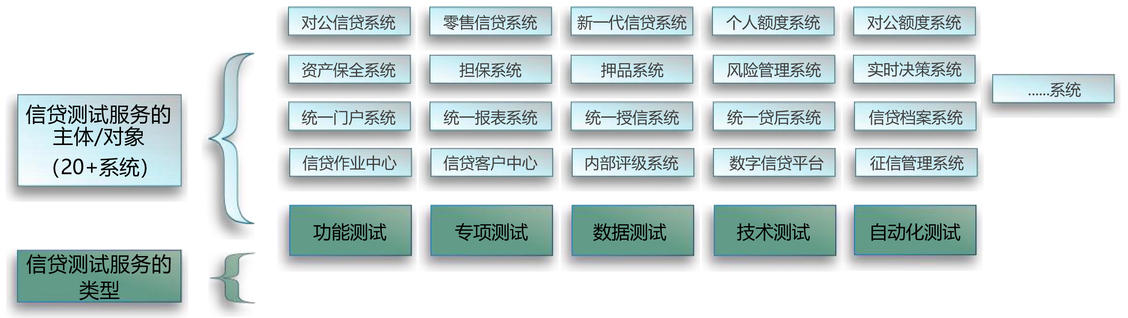 提供全面的测试服务,涵盖新信贷、、、对公/零售信贷等20+信贷类系统,,,以及功能、、、性能、、、、数据、、、自动化等类型测试。。。。