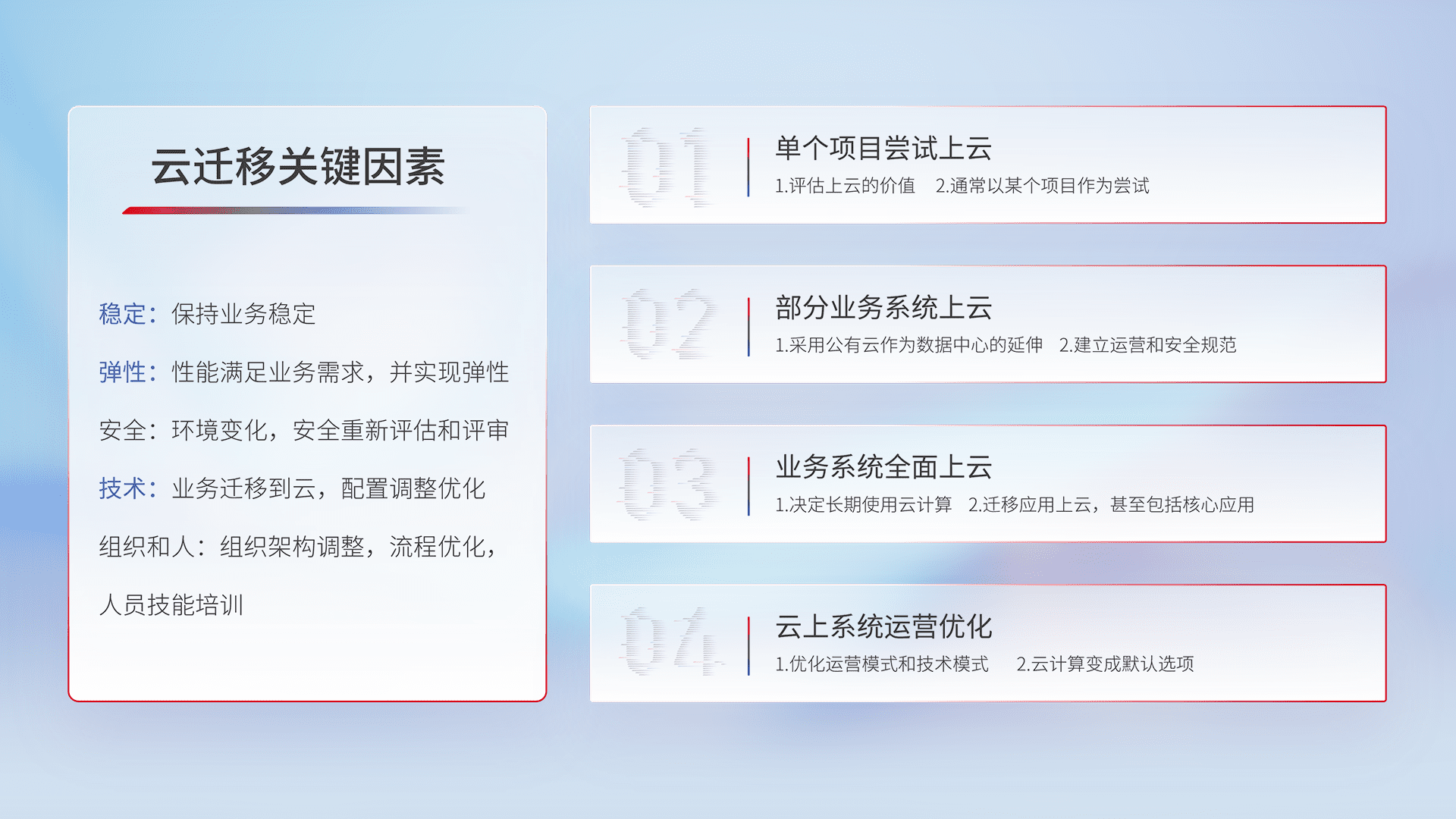 结合实际业务,,,,从规划设计、、、、云平台选型、、、云原生改造、、数据迁移、、集成交付,,,迁移全过程为客户识别最佳上云路径,,,,做好风险识别管理,,,设计网络架构、、、、身份权限、、、安全审计合规、、、、操作审计、、、、日志审计、、监控告警策略、、、、多站点容灾设计等,,,对云上基础设施进行整体规划,,,,提升IT治理水平,,,以满足弹性、、、高可用、、、、高性能的需求。。