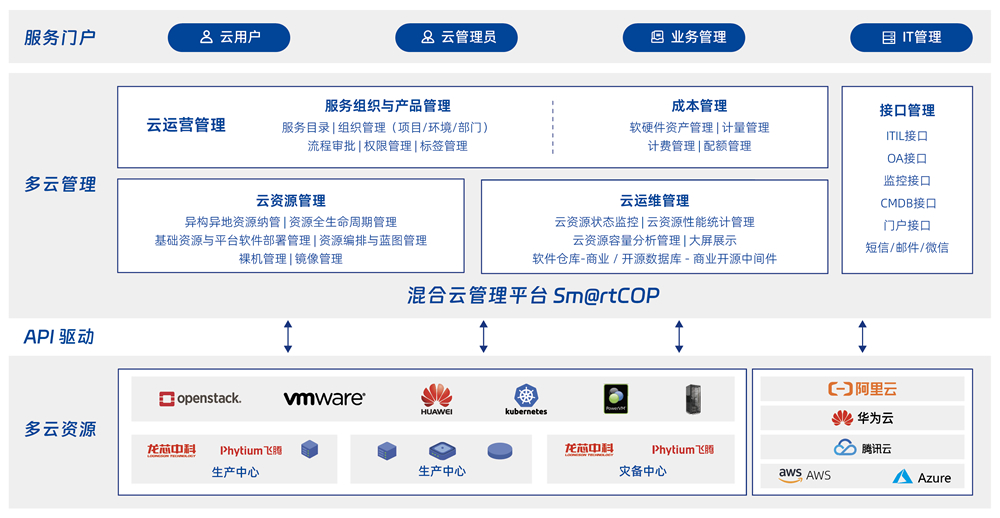 面向各行业用户多云资源管理、、、运维及服务提供的综合挑战,,,提供异构异地异芯片多云资源的统一管理、、统一运维、、统一监控及统一运营服务,,,简化多云管理复杂度,,,,提升用户用云满意度,,释放云平台业务价值。。。。