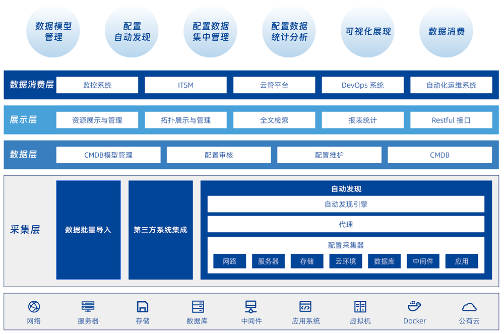帮助用户建立统一的运维主数据,,,通过各种自动化手段实现以应用为核心的全面资源管理以及运维消费场景共享。。系统具备灵活的 CMDB 分层建模和配置信息维护机制,,,可以提供面向业务的 IT 架构画像,,为各个运维工具提供集中化的资源信息管理和协同,,为 IT 运维和 DevOps 体系下的各种运维场景提供数据消费服务。。。
