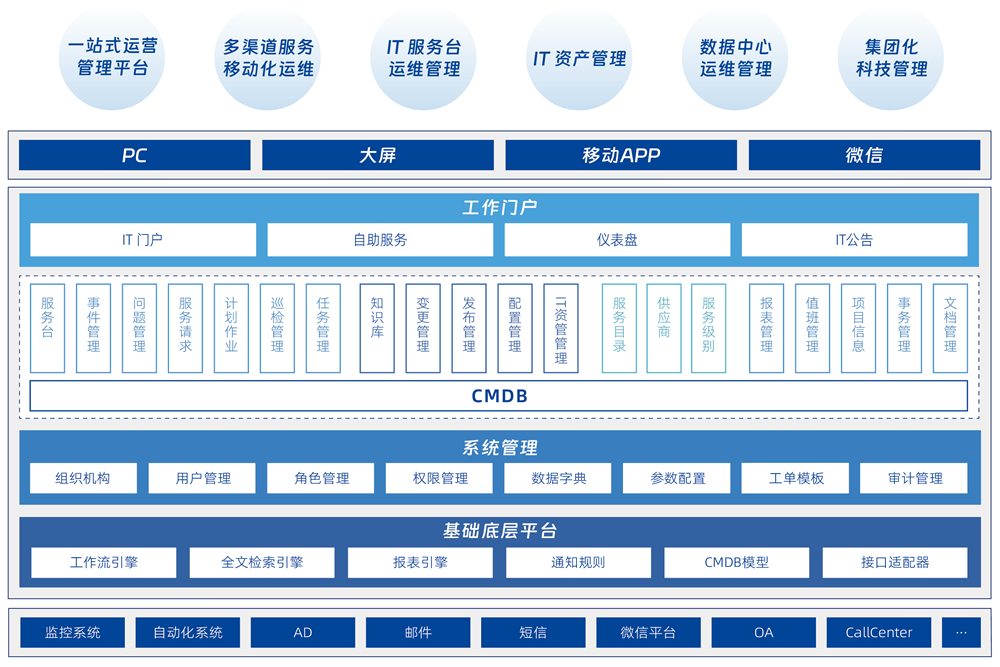 提供一站式 IT 服务管理咨询及解决方案,,,,为 IT 服务数字化运营管理赋能。。。整个系统基于 ITIL 最佳实践和 ISO20000、、ITSS 等标准的 IT 管理的「ERP」,,,致力于帮助金融、、、、政府、、大中型企业等行业客户快速实现自助服务台、、、事件管理、、、IT 资产管理、、、、SLA 管理等核心流程,,构建以服务为导向的 IT 服务管理体系,,,有效提升 IT 服务效率和效果,,,,实现 IT 服务的标准化、、可视化、、、流程化、、、、移动化和精细化管理。。。。