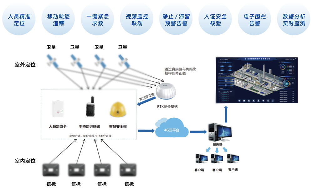 室内室外融合定位技术,,确保作业人员、、、车辆位置可实时监测,,,,及时预警,,,,可有效减少或避免安全事故的发生。。。。